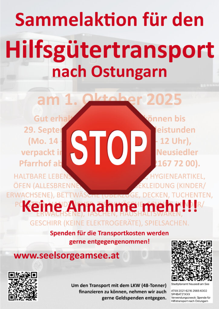 Die gut erhaltenen Sachspenden können (wenn möglich in Bananenkartons verpackt) bis 29. September 2025 im Pfarramt Neusiedl am See innerhalb der Kanzleistunden, Hauptplatz 3, abgegeben werden.