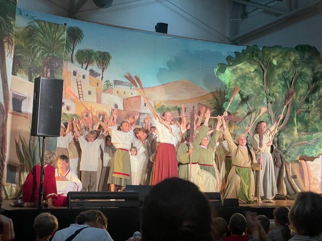 In unglaublichen 4 Tagen im Rahmen einer Ferienwoche schaffte es ein jugendliches Team der KISI-Kids, mit 45 Kindern und Jugendlichen das neue Musical Zachäus einzustudieren und äußerst professionell in Neusiedl und Apetlon aufzuführen. Hochmotiviert und mit großer Begeisterung und viel Schwung spielten die jungen Laiendarsteller*innen in Anlehnung an die Bibel die Geschichte des kleinen Zachäus, der als Kind gemobbt und ausgeschlossen und von seinem Vater gedemütigt wird. Er kann seinen Ansprüchen nicht genügen und entschließt sich daher, fortzugehen und es allen zu beweisen, dass er erfolgreich werden kann. Er schließt sich den Römern an, wird Zolleinnehmer und kehrt als Erwachsener in seine Heimatstadt Jericho zurück. Jedoch ist er zurückgekommen, um mit allen abzurechnen, die ihm als Kind das Leben schwer gemacht haben. Er verlangt am Zoll einen Wucher-Preis für die Marktwaren und lässt jeden seinen Hass auf die Menschen spüren. Erst als Jesus in die Stadt kommt und bei ihm zu Gast sein möchte, weicht seine Verbitterung von ihm und er wird zum Positiven verwandelt. Wie die Geschichte ausgeht, kennt man aus der biblischen Geschichte. Die Zuschauer erleben ein Wechselbad der Gefühle: Erstaunen über die einfallsreiche Inszenierung, die den Bäumen Leben einhaucht und den Maulbeerfeigenbaum zum Freund von Zachäus und zum Erzähler macht, Mitgefühl mit dem verspotteten kleinen Zachäus und Antipathie, als er nach seiner Rückkehr als gieriger und hartherziger Zöllner alle tyrannisiert. Die fröhliche Tanzszene, als Jesus in die Stadt kommt, läutet die Wende zum Positiven im Stück ein. Die Zuschauer können sich über den lustigen Besentanz der Dienerinnen amüsieren und eine berührende Versöhnungsszene miterleben. Zum Schluss werden sie beim Höhepunkt, dem Seeker oft he lost-Lied, förmlich mitgerissen mit den vor Freude und Elan sprühenden begeisterten Kindern und Jugendlichen. Das zahlreich erschienene Publikum dankte es den Kindern mit einem tosenden Applaus und unzähligen positiven Rückmeldungen. Auch das Bühnenbild begeisterte, welches vor allem in Neusiedl aufgrund des großen Platzangebotes fantastisch war und der überlebensgroße Baum bildete eindrucksvoll den Mittelpunkt des Stückes. Viele verschiedene Rollen und Solo-Gesangsstellen motivierten die Kinder und brachten eindrucksvoll viele verborgene Gesangs- und Schauspieltalente hervor. Auch die Tanzeinlagen waren überwältigend.