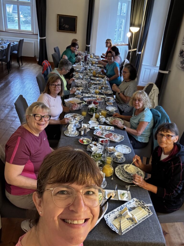 Das Frühstück am nächsten Morgen war so liebevoll gedeckt, dass wir nun von einer Prinzessinnen-Wallfahrt gesprochen haben. Gestartet sind wir bei herrlichem Wetter in Frein an der Mürz, die erste Pause war in Schöneben und die zweite in Mooshuben. In Mariazell war die Heilig-Brunn-Kapelle reserviert, wo wir dann mit einer Wortgottesfeier, unsere Ankunft gefeiert haben, bevor es dann wieder nach Hause ging.
