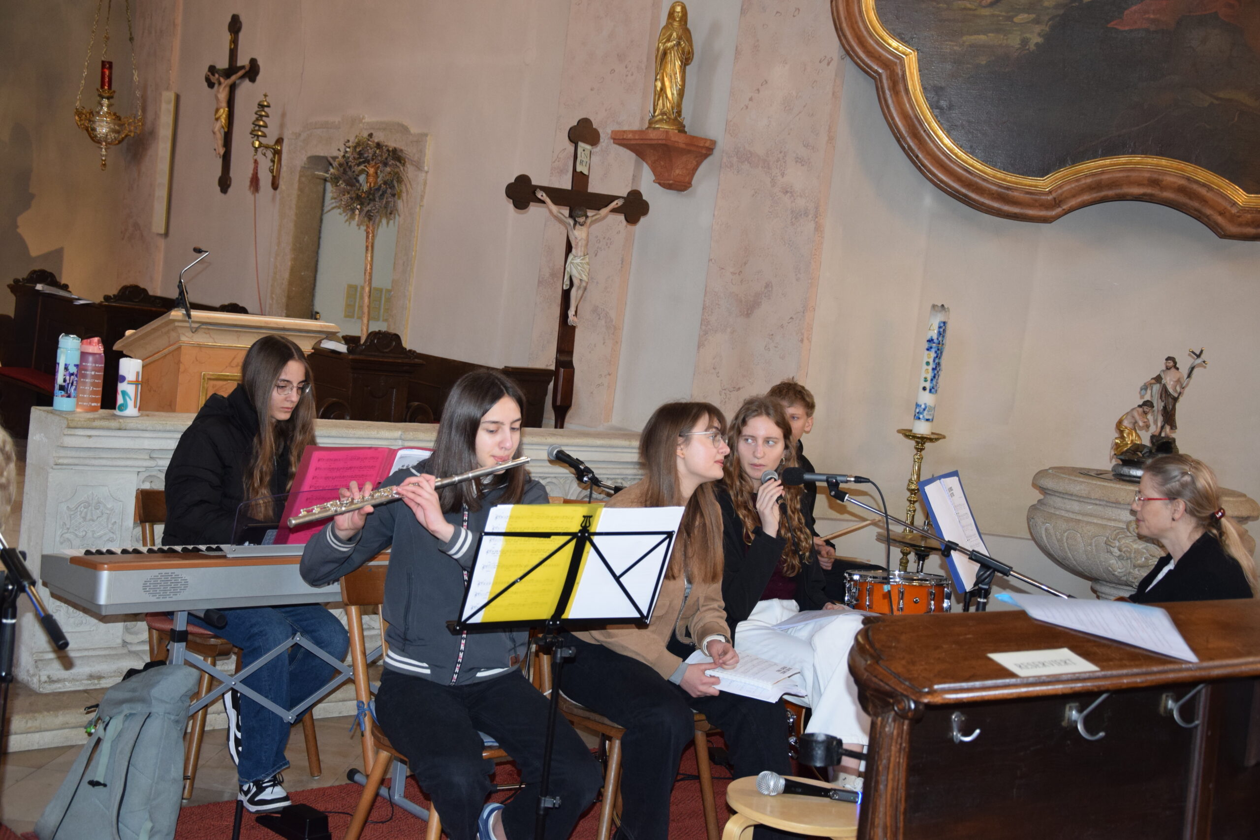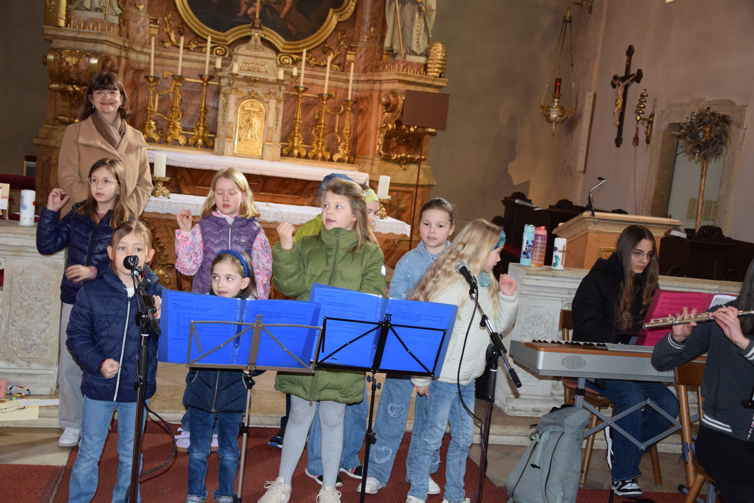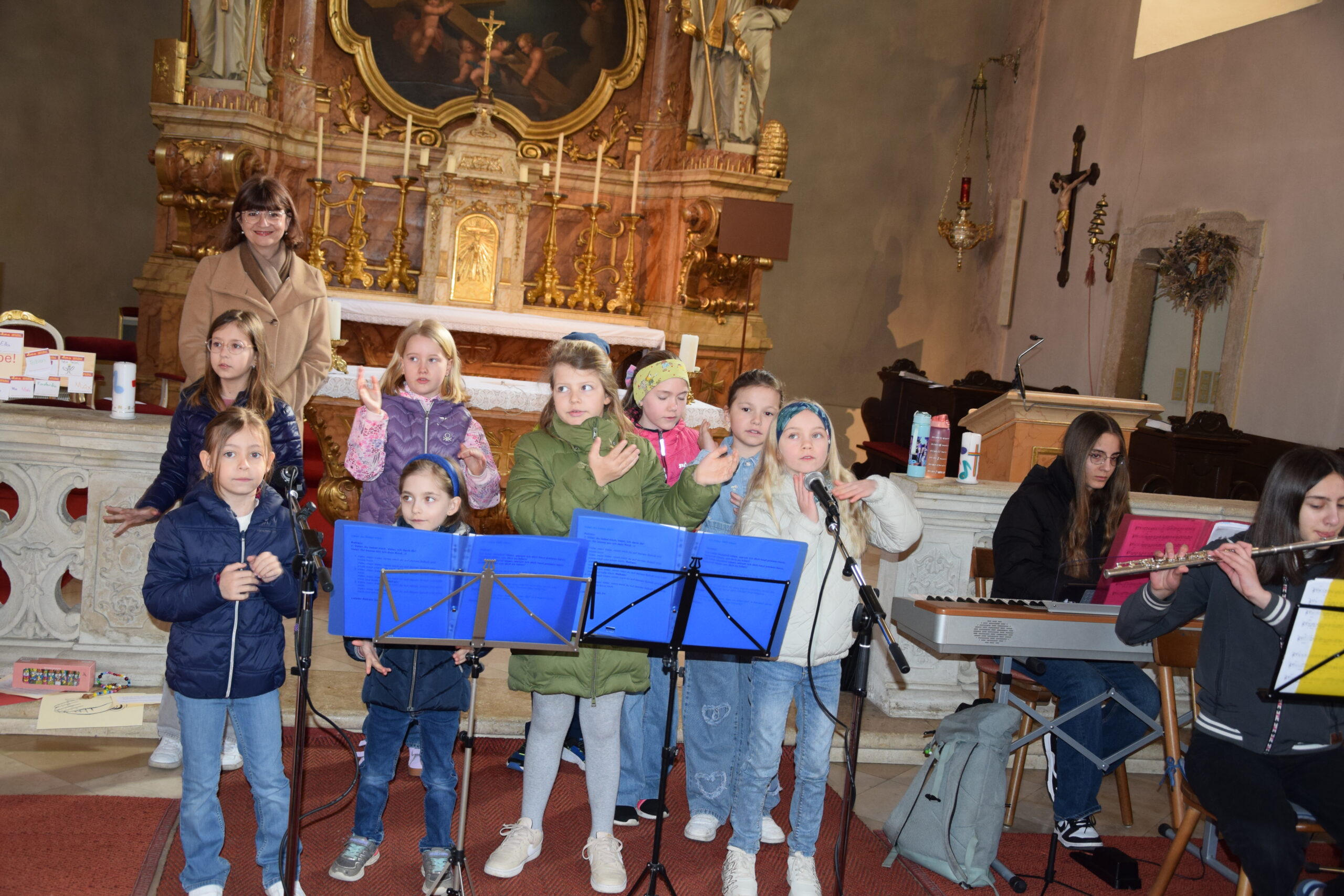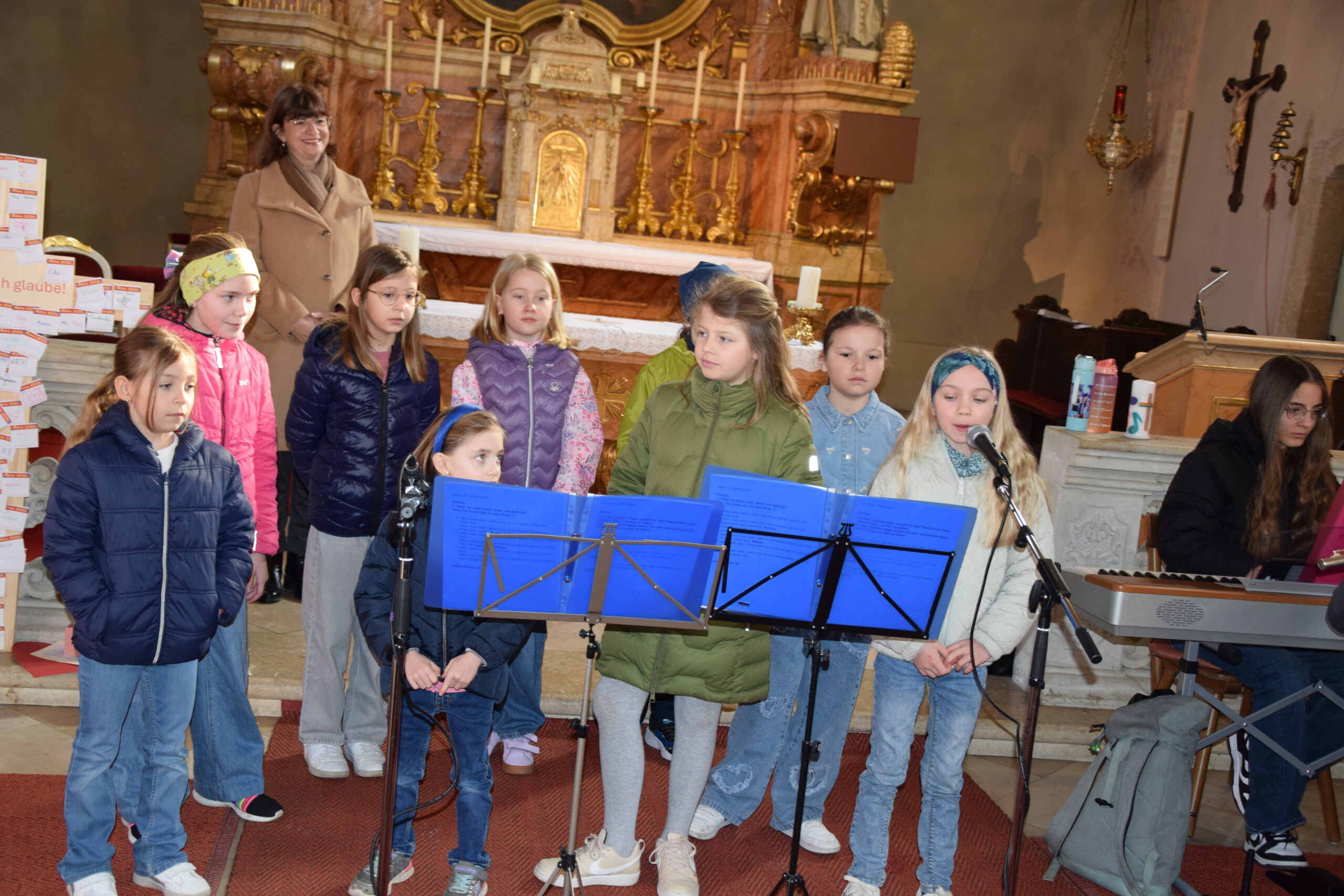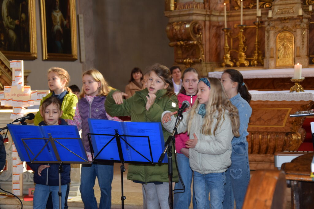 Bei dieser Feier stand nicht nur das gesprochene Wort Gottes im Mittelpunkt; durch die musikalische Gestaltung der Kinder- und Jugendgruppe Sing4ever unter der Leitung von Laura Tschida wurde auch das gesungene Wort mit wunderbaren Stimmen und Klängen bereichert. Die Kinder und Jugendlichen von der Gruppe Sing4ever versprühten sichtliche Freude, von der sich die Gottesdienstbesucher anstecken ließen und machten so dem Sonntag Laetare (Freude) alle Ehre.